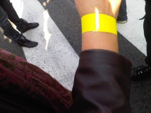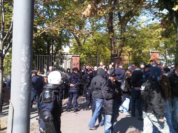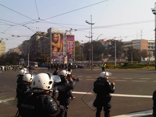 Silazimo ka Slaviji praćeni pogledima ljudi u kapuljačama. Ne znamo da li su to pubovi u civilu ili nazovimo ih desničari (moramo naći adekvatniji izraz ali deca nisu). Na Slaviji kao ide saobraćaj, mada policija polako preusmerava vozila na drugu stranu. Već to me brine, jer vidim stari plavi kec koji se zaleti u kordon pa stane, pa se opet vrti oko Slavije. Tu su i neki motoristi u maskirnim pantalonama koji prave krugove po Slaviji. Nisu došli da nas pozdrave. Počinje frka, uvlače nas iza prvog prstena. Sve jako, jako dugo traje. Srećemo poznate ljude. Što reče neko kao na sajmu NGO. Dolaze i poslanici, gradski sekretar … Žena pored mene se izbezumi svaki put kada se čuje topovski udar. Prvi suzavac se oseća ali na sreću u tragovima. Sve vreme tvitujem i izveštavam. Već na početku šok. Uzimaju nam podatke i daju nam žute trake. Asocijacija loša.