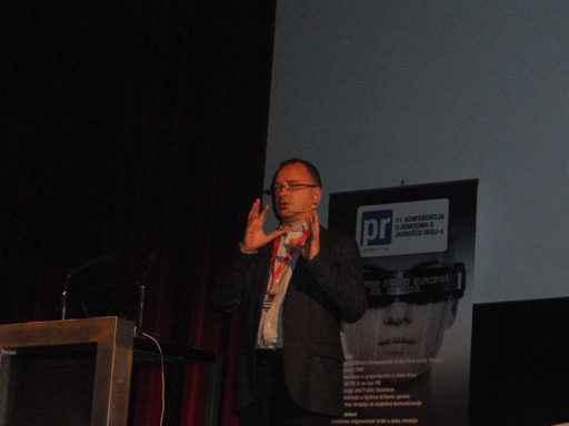 Dejan Verčić – je predstavio najnovije istraživanje Communication monitor koje je po četvrti put rađeno, ovoga puta na uzorku od 1950 PR praktičara iz 46 zemalja Evrope. Ciljna grupa ovog istraživanja su PR praktičari, kako bi on to rekao „elita evropske PR struke“. Ono što se provlačilo kroz celu prezentaciju istraživanja je upućivanja na našu percepciju, kada pričamo o budućnosti struke. Istraživanje je pokazalo da precenjujemo značaj interne i on line komunikacije u budućnosti. Predviđali smo ranijih godina puno više od onoga što se stvarno dogodilo. Iznenadilo me je da bez obzira na svu on line priču, štampa ostaje i dalje najznačajnija alatka u PR-u i da je za 76% profesionalaca press kliping i dalje dominatan način evaluacije. Samo 25% evoluira svoj rad posmatrajući outflow, tj. uticaj na prihod. Dejan kao stari PR mačak i izuzetan stručnjak je govorio o tome da je i dalje percepcija, i u Evropi, PR-a kao struke u nastajanju i da je zato važno da imamo što više podataka iz istraživanja i analiza. 82% PR praktičara u Evropi je zadovoljno svojim poslom. Ono što je Dejan postavio kao tezu je da kao struka nemamo uređene mehanizme kako se u struku ulazi, kako se napreduje i kako se iz struke izlazi. Govorio je o D. Cameronu, britanskom premijeru kao nekom ko je krenuo iz struke. Današnje moderno društvo je u suštini komunikacija. Ako želimo nekoga analizirati, moramo analizirati njegovu komunikaciju. Povezao je to sa organizacijama/kompanijama, za koje je rekao da su isto tako komunikacija, a ne njihov identitet. Ne znam zašto ali moja prva impresija na ovu rečenicu je bila Demokratska stranka. Istraživane je pokazalo da 85% PR-ovaca pomaže organizaciji u ostvarenju njenih ciljeva ali samo 62% od njih učestvuju u kreiranju istih. 41% PR-ovaca u Evropi je osetilo krizu na svojim plećima, jer su im se smanjile plate. Ogroman je raspon u platama PR-ovaca u Evropi od 30.000 do čak preko 300.000 € godišnje.
