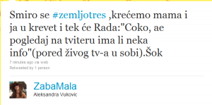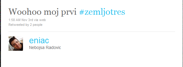 Naravno, sutradan sam prešao kroz hashtag #Zemljotres i ključu reč “zemljotres” i sve ostalo formirao sa konkretnim tweetovima koji to podržavaju (ko je prvi tweetnuo o zemljotresu, ko je prvi sa hashtagom, kad je izbačen kajron a kad studijske vesti) 🙂