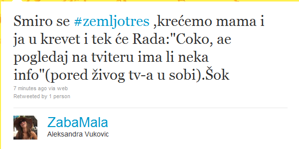 Mala ispravka, RTS je pustio kajron pola sata od zemljotresa koji je bio otprilike- tamo negle, naculi smo gde, se desio zemljotres, uskoro opsirnije informacije i to je islo, islo, islo dok sam ja na Twitteru vec imala precizne podatke. I postavila sam slicno pitanje, kako se niko nije setio, u eri visoke tehnologije, da gvirne na Twitter. Ali, zamisli da neko kaze ”informacije sa drusrvene mreze…”. Ja sam prosto sigurna da zvanicni offline mediji ne zele da daju znacaj online informacijama jer bi tu vec svasta moglo da bude. Uopsteno.