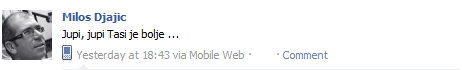 Obradovao si nas što je Tasi bolje. Junak je ona! Ljubim je i šaljem jedan smajlić 🙂