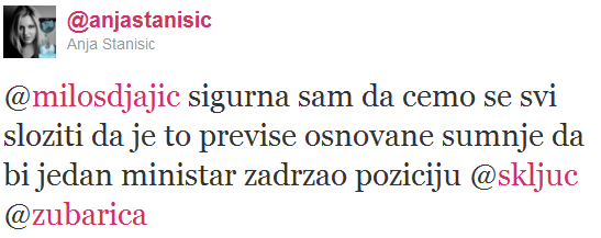 “Kada se pomene reč OSTAVKA uvek se setim ministra Dušana Mihailovića koji nije podneo ostavku zbog ubistva premijera ili Dragana Veselinova čiji je vozač ubio Katarinu na pešačkom prelazu … Zbog prošlogodišnje nesreće u Užicu, recimo, niko nije osetio potrebu da preuzme odgovornost i kao moralan čin podnese ostavku”.