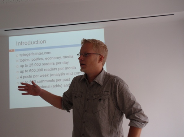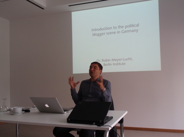 Robin Meyer – Luch, www.carta.info je bio prvi predavač u popodnevnom delu. On smatra da uloga i pozicija blogova u jednom društvu zavi si od slobode medija. Što su mediji otvoreniji blogovi su manje uticajni  i obrnuto. To je, po njemu i uzrok zašto uloga blogera u Nemačkoj nije veća, a da li je to baš tako videćemo do kraja našeg bogger tour-a. Nemačka blogerska scena popunjava praznine koje klasični mediji ne pokriju (ostave). Svaki blog bi trebalo  da doda nešto kvalitetno, neki sadržaj koji će unaprediti ili olakšati život onima koji ga čitaju (Gaga o tome često govori). Njegova je procena da je uticaj Facebook-a u Nemačkoj mnogo veći nego blogova. FB  ima više od 10 miliona postova dnevno, a novih blog postova ima između 60.000 – 100.000. Predstavio nam je dva servisa Vlade i Parlamenta koji bi mogli biti intersantni i institucijama u Srbiji. Vlada ima svoj portal  koji im služi za političko savetovanje tj. učešće zainteresovane javnosti u vezi svake teme koja je na drušvenoj agendi. Parlament ima super foru sa prikupljanjem e potpisa. Na ovom sajtu možete potpisati peticiju. Kada se skupi 50.000 potpisa ta tema, Zakon ili već stavlja se na dnevni red sledeće sednice parlamenta. Lep primer transparentnosti. Ukazao nam je na to da su i njihovi političari imali problema sa online zajednicom tako da su Predsednik i Ministar odbrane morali da daju ostavke zbog materijala koji se pojavio na Internetu.