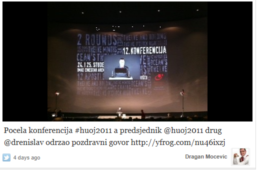 Na poziv Hrvatske udruge za odnose s javnošću (HUOJ), 24. i 25. novembra sam bio njihov gost na dvanaestoj Konferenciji, koja je organizovana u Zagrebu u modernom Arena centru. Ovo je bio četvrti put da posećujem njihove godišnje konferencije. Prvi put je to bilo u septembru davne 2007. u Rovinju. Namera mi je da bar u nekoliko rečenica približim koleginicama i kolegama u Srbiji o čemu se na Konferenciji razgovaralo. Žao mi je što veći broj koleginica/kolega iz Srbije nije prisustvovao Konferenciji, tako da su čak i besplatne kotizacije ostale neiskorišćene. Konferencija je ove godine održana u velikoj dvorani IMAX multipleks bioskopa (kina) CineStar, za sve nas na po malo neuobičajenom mestu. Ogromna sala je imala svoje prednosti i nedostatke. Nedostaci su sigurno fizička odvojenost predavača i panelista od publike, a prednosti ogromno platno, udobne stolice i dobre tehničke mogućnosti. Ono što će sigurno ostati kao utisak je šok izazvan saznanjem koliko malo ljudi u Hrvatskoj PR struci koristi Twitter. Naprosto nisam mogao da verujem. Na zvaničnom #huoj2011 da nije bilo nas iz Srbije skoro da ne bi ni bilo tvitova, a da ne kažem koliko se malo ljudi uključilo u konverzaciju o izrečenom na Konferenciji.