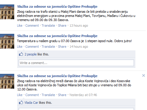 Na Facebook-u se može uz pomoć reklama promovisati aktivnosti, a fan stranica dozvoljava i pozivanje na događaje čime se ujedno obaveštavaju i građani. Facebook je mesto i sa kojeg se može izveštavati o svakom susretu sa građanima, kao i o donetim zaključcima i odlukama. Dobri primeri iz kojih se svašta da naučiti su sigurno profili Saše Paunovića, Gorana Ješića, Saše Vučinića … kao i fan stranica službe za odnose s javnošću opštine Prokuplje.