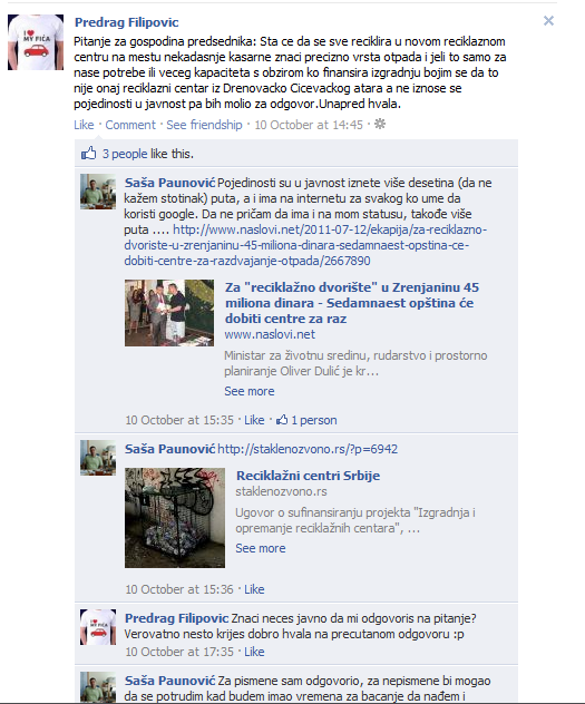 Saša je odavno na Facebook-u gde ima preko 3.000 prijatelja što je otprilike 5% od ukupnog broja građana Paraćina. On sam vodi svoj nalog i na najbrži mogući način izveštava građane o svemu što se u opštini radi. Način na koji on promoviše svoj rad je dobar primer kako bi funkcioneri trebali da koriste društvene mreže. Njegova pojašnjenja aktivnosti i odluka, upućivanje na planove, podsećanje na Zakone su upravo onaj sadržaj koji građani očekuju. Na početku su dijalozi bili ogromni i njegovi statusi su imali preko 70 komentara. Danas su se svi već navikli i samo u izuzetnim slučajevima se povede dugačka diskusija. Ono što je dobro je da građani koriste ovaj kanal komuniacije da pitaju predsednika svoje opštine bez da zakazuju sastanke, odlaze u opštinu….Dijalozi, upornost i posvećnost pokazuju ono što je građanim najvažnije, a to je da je neko iskren i posvećen svom poslu tj rešavanju problema građana.