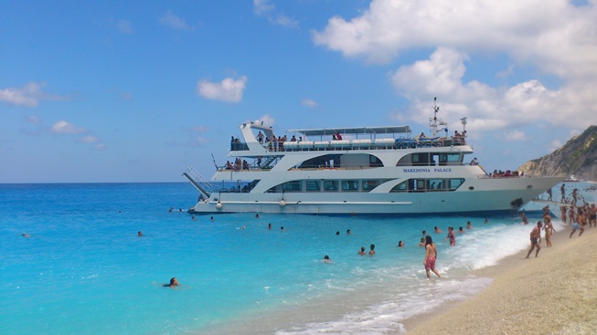 Na svakoj od većih i posećenijih plaža srešćete prodavce izleta brodom. Radi se o jednodnevnom izletu brodom koji polazi iz Nidrija (istočna strana ostrva) ide do Egremni plaže, pa na Kefaloniju, Itaku, Skorpios i vraća se uveče natrag. Postoje tri broda koja paralelno idu Makedonija palas, Nidri star i … Izlet je dosta naporan jer traje čitav dan i utisci su ti koji te u stvari umore. Kada ti prodaju izlet objasne ti da su pauze velike ali na kraju to ne bude tako. Svaka od pauza nam je skraćivana od 15 minuta do 45 minuta. To je ono što malo smeta jer je stalna presija da se kreće dalje. Najveći put je na početku od Nidrija do Egrmeni plaže. Tamo je predviđeno kupanje u trajanju od 2h a ostali smo 1h 20 min. kada još odbiješ ulaske i izlaske sa broda to ispadne na kraju 1h. Slatko je što može da se skače sa broda. Zatim se malo stane na plaži Porto Katsiki gde samo poskačemo u vodu 15 min i krećemo dalje. Kefalonija i mesto Frisado su veoma slatki i zagolicali su nam pažnju. Tu se ostaje da se ruča i šeta i ima svašta nešto da se vidi. Zatim se ide na Itaku gde se takođe stane u slatkoj luci. Posle toga se obđe pećina koja je daleko ružnija od Plave špilje ali ima istoriju da se tu krila grčka podmornica tokom drugog svetskog rata. Na kraju se dolazi do Skorpios ostrava koja su u vlasništvu porodice onazis. Ništa specijalno verujte mi.