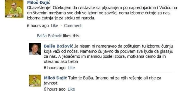 Čekajte malo gospodine Đajiću, a šta ćemo sa onim montažama i provlačenjem po blatu SNS kadrova na internetu? Koliko me sećanje dobro služi i oni su isto tako reagovali na neke printskrinove koji su se pojavili. Ja znam da ste Vi otvoreno za DS i nemam ništa protiv ali ovakav tekst sa ovakvom porukom je kontraproduktivan, najmanje u onoj meri koliko mislim da glasanje za SNS ovu zemlju može da odvuče dublje nego što ju je DS za vreme svog mandata odvukao. Za ovakav potez, jedna velika jedinica za Vas.