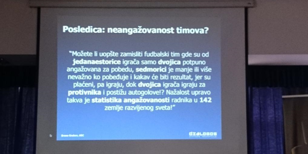 Sve je očiglednije da nam je, za postizanje uspeha, u današnje vreme potreban novi model menadžmenta. Taj model bi trebalo da učini da zaposlene ne teramo da rade, već da učinimo atmosferu i uslove u organizaciji takvima da se oni samostalno angažauju na svojim poslovima. Zanimljivo mi je bilo slikovito poređenje, na primeru fudbalskog tima, prosečne angažovanosti radnika, a na osnovu istraživanja u 142. zemlje sveta koje je uradio Gallup . Ono je pokazalo je da se od 11 igrača u jednom timu samo dvojica u potpunosti angažuju za pobedu. Za njih sedmoricu potpuno je nebitno ko će pobediti jer to rade zbog plate, a dvojica čak daju autogolove. Sa takvim timom nema uspeha i to je svima jasno. Pitanje svih pitanja je kako da ovih sedmoro motivišemo da se angažuju u ostvarenju pobede. Zaposleni mogu biti zadovoljni uslovima na poslu ali to nam ne garantuje njihovu punu angažovanost. Bez takve anagžovanosti teško da ima uspeha u budućnosti.