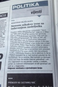 U političkim obračunima česte su ovakve situacije kada jedni da bi naudili drugim podmeću informacije novinarima ili u dogovoru sa njima prave ovakve tekstove. Prvo su plasirali vest kao nešto značajno i to na drugoj strani novina (ako sam dobro razumeo), a zatim zbog moje reakcije i demantija, koju su verovatno i priželjkivali, nastavljaju da o tome pišu još koji dan. Danas očekujem najavljeni odgovor novinarke.