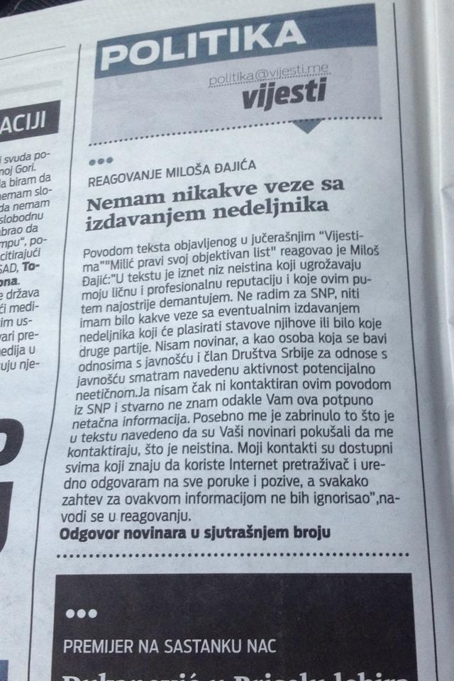 U tekstu je iznet niz neistina koji ugrožavaju moju ličnu i profesionalnu reputaciju i koje ovim putem najostrije demantujem. Ne radim za SNP, niti imam bilo kakve veze sa eventualnim izdavanjem nedeljnika koji će plasirati stavove njihove ili bilo koje druge partije. Nisam novinar, a kao osoba koja se bavi odnosima s javnošću i član Društva Srbije za odnose s javnošću smatram navedenu aktivnost potencijalno neetičnom.