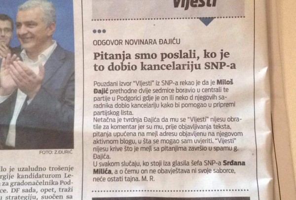 Kao i svakog četvrtka (9.4.2015. prim.aut.) uputio sam se za Novi Sad na časove Akademiju. Između prvog i drugog časa stigla mi poruka drugarice iz Podgorice što se ne javim, kada sam se instalirao u Podgorici, da pijemo kafu. Iznenađeno odgovorih da bi bilo lepo da sam u PG ali da je prvi najavljeni odlazak na Spark.me konferenciju. Pitah je šta su napisali ali ostah bez odgovora…. Nakon toga stiže fotografija strane iz novina gde sam ja tobože angažovan da radim za Socijalističku narodnu partiju (SNP). Najviše mrzim takve dane koji zbog neke gluposti potpuno promene tok. Sedim na kolokvijumu nerviram se zbog teksta. Razmišljam ko bi imao interes da tako nešto napiše.