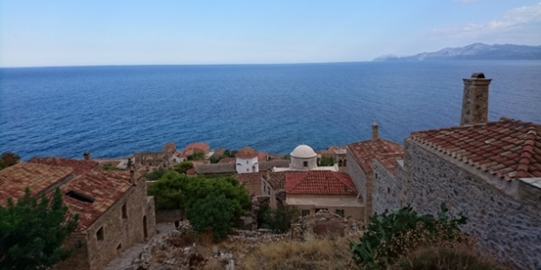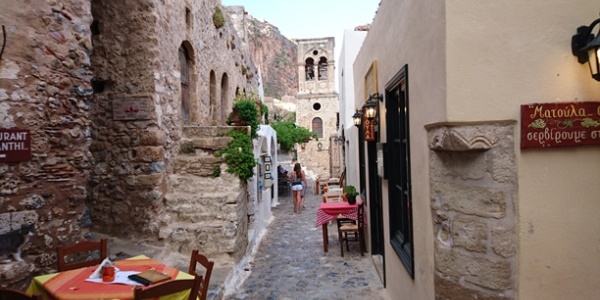U povratku sa plaže Simos otišli smo da vidimo još jednu od atarakcija prvog prsta (polu)ostrvo Monemvasiu i presladak gradić tvrđava koji se tamo i dalje obnavlja. Monemvasiu su nazivali “Gibraltarom istoka” kao važnom lukom za čitavu Lakoniju. Radi se o ostrvu čudnog oblika jer ima visoravan na 100m/nmv. Samo ime govori o “jednom ulazu” kojim se na ostrvo može doći. Radi se o utvrđenju koje je na popisu svetske kulturne baštine UNESCO-a. To je jedno od retkih mesta tokom ovog letovanja gde smo samo sretali strane turiste.
