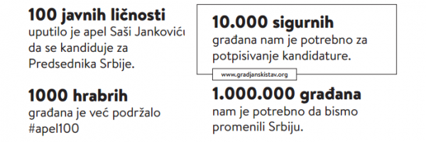 Analizirajući rezultate prošlih izbora, dolazimo do toga da bi okupljanje oko Saše Jankovića u startu brojalo oko 700.000 glasova ljudi koji su u aprilu izašli i glasali za pomenute opozicione stranke. Već je ovaj broj dobra vest za Srbiju, jer pokazuje da nas ima i da posedujemo određenu snagu. Siguran sam da će tokom kampanje taj broj rasti, jer ćemo imati priliku da biramo građanskog kandidata jasne vrednosne orijentacije i politike.