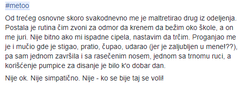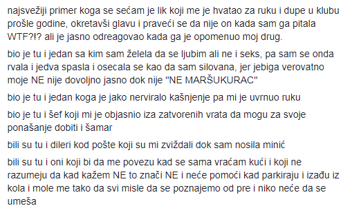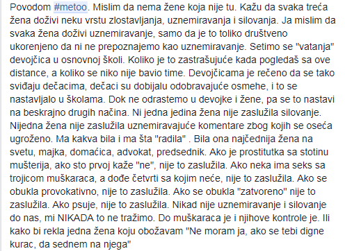 Pišem ovo sa željom da podržim kampanju i uputim apel na roditelje koji vaspitavaju svoje dečake da je uznemiravanje devojčica normalno da sa tim prestanu i da pročitaju sve ispovesti i patnje kroz koje su naše prijateljice, rođake, sestre, ćerke prošle ili prolaze. Takođe apelujem i na roditelje devojčica da isto tako prođu kroz ove ispovesti i objasne im da nasilje nikada ne sme biti normalno ponašanje i da NE uvek znači NE!