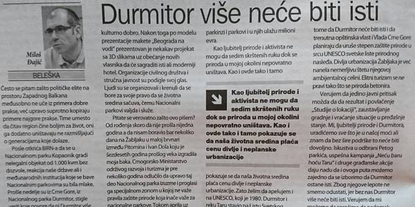 Nakon blog posta Durmitor više neće biti isti napisao sam odmah i članak za novine. Strpljivo čekajući skoro mesec dana tekst je ugledao svetlost dana u dnevnom listu Danas.