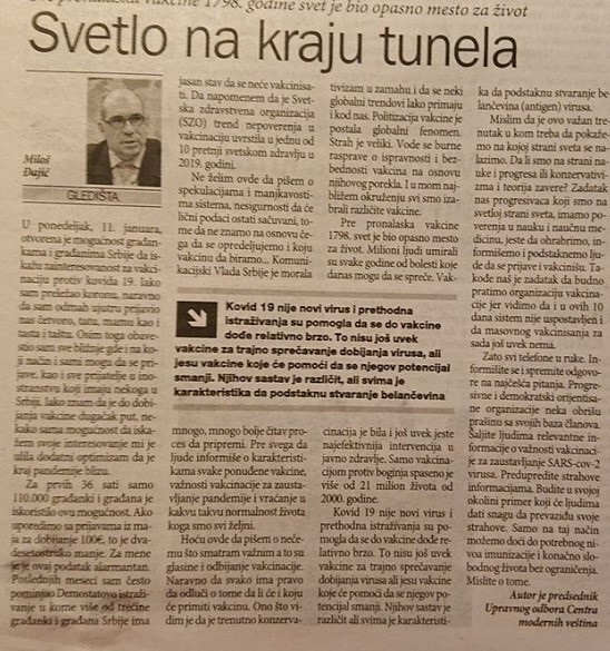 Mislim da je ovo važan trenutak u kom treba da pokažemo na kojoj strani sveta se nalazimo. Da li smo na strani nauke i progresa ili konzervativizma i teorija zavere? Zadatak nas progresivaca koji smo na svetloj strani sveta, imamo poverenja u nauku i naučnu medicinu, je da ohrabrimo, informišemo i podstaknemo ljude da se prijave i vakcinišu. Takođe naš je zadatak da budno pratimo organizaciju vakcinacije jer vidimo da i u ovih 10 dana sistem nije uspostavljen i da masovnog vakcinisanja za sada još uvek nema.