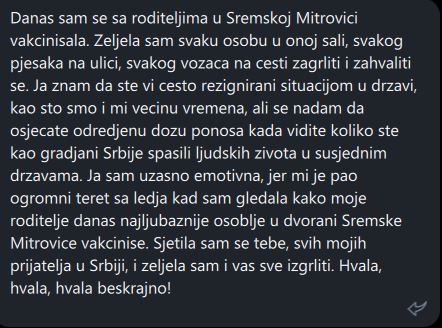 Otisla sam da se vakcinisem u BG jer to za mene znaci zivot. Proslog jula sam se izvukla koroni, kako ne znam. Jer ljudima poput mene, s opstruktivnom bolescu pluca, bas i nisu davali neke sanse. 1