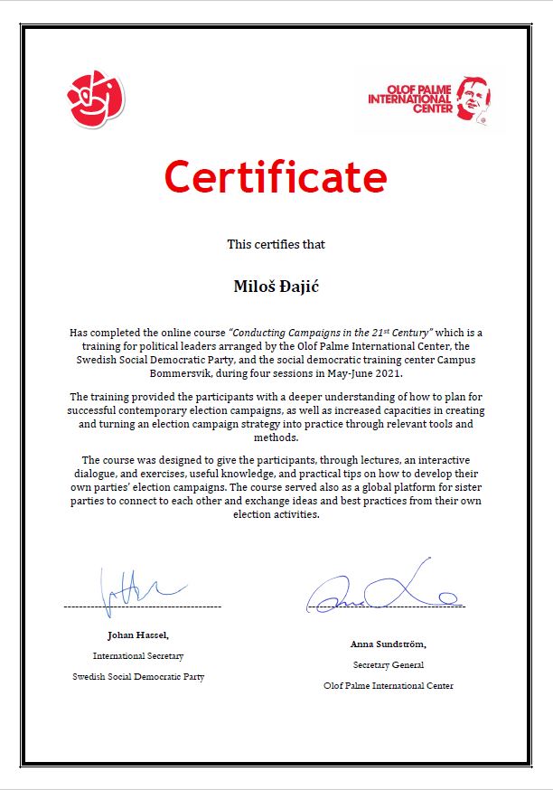 Zahvaljujući podršci Olof Palme međunarodnog centra zajedno sa preko 30 učesnika učesnica iz Azije, Afrike, Južne Amerike, Istoćčne Evrope, Zapadnog Balkana i Bliskog Istoka prošao sam obuku “Upravljanje kampanjom u XXI”