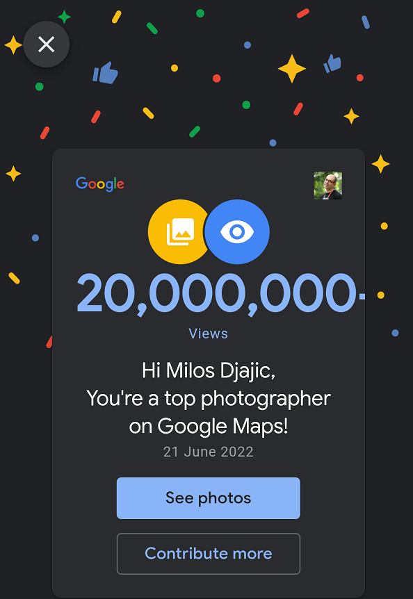 Pre neki dan stigla mi je notifikacija da su moje fotografije na google mapama pregledane 20 miliona puta.