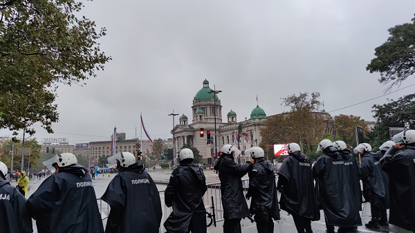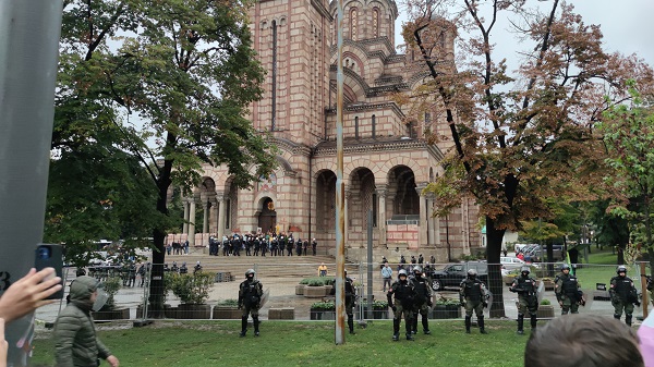 Policija je demonstrirala nepotrebnu silu svojim masovnim prisustvom, jer nikakve istinske opasnosti nije bilo. Šetnja ili sprovođenje je išla trasom Bulevar Kralja Aleksandra do bivšeg JAT-a a onda tramvajskim šinama do stazice u parku, pa tom uskom stazicom do glavne aleje Tašmajdanskog parka. Onda alejom do ulice Starine Novaka pa tu na pola kolovoza do Ilije Garašanina. Čudi me da Ministar policije u tehničkom mandatu nije smislio da idemo Aberdarevom ulicom jer bi to sprovođenje bilo još kraće.