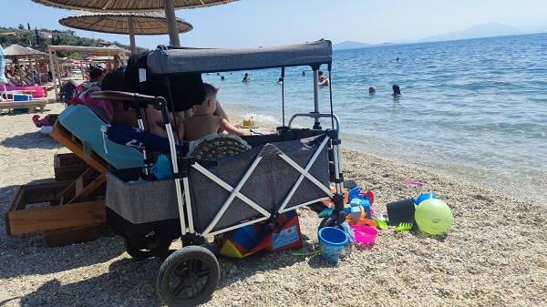 Plaža ima mali broj ležaljki tako da nije sigurno da možete uvek da se nadate da ćete naći slobodne. Pored prostora za ležaljke postoje i sa jedne i sa druge strane mesta za vaš suncobran i stolice. Postoji tuš na plaži. Voda mora je čarobno tirkizna i prelepa. Kada smo bili ujutru nije bila gužva ali verujem da zna da bude. Nemojte da vas iznenade i divlji kamperi koji su prethodnu noće proveli na plaži. To je očigledno normalno na Pelionu.