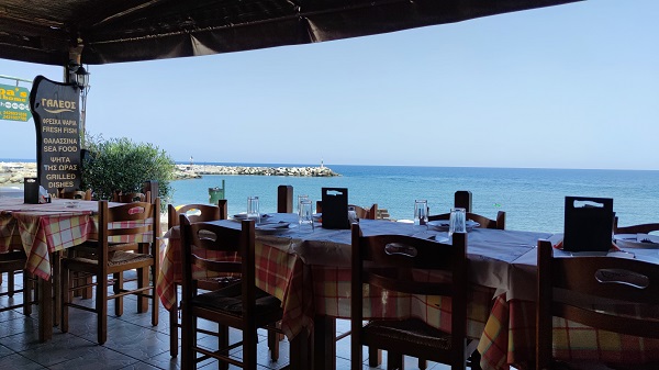 Za ručak smo izabrali odličan porodični restoran Galeos. On se nalazi na kraju ogromne gradske plaže na samom šetalištu. Odličan restoran gde rade tri generacije ljubaznih muškaraca. Inače gradska plaža je povezana stepenicama sa šetalištem jer se nalazi 4-5 menara ispod visine ulice. Na njenom samom kraju se nalazi mala luka sa koje je prostire lep pogled na sam gradić.