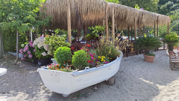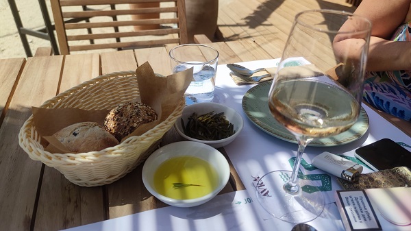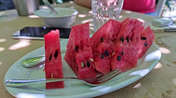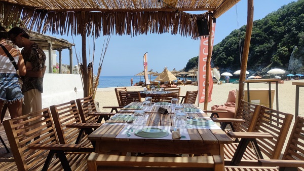 Nakon Fakistre, ogladneli, potražili smo drugu plažu sa bar nekim barom. Izbor je pao na Limnionas. Ovo je bio dan za nekoliko spuštanja strmim zemljanim putevima ka plažama. Stalno se vraćate na magistralni put koji je negde na 400 mnv. Čim smo stigli našli smo mesto za parking u hladu i krenuli na plažu. Na samoj plaži je restoran/bar koji kao da je direktno sa Vračara spušten na plažu. Brendirane kecelje, muzika, način ophođenja, uređenost stola i pristup gostima podizali su očekivanja. Sve je podređeno gostu i njegovom užitku i bilo je dosta iznenađujuće.